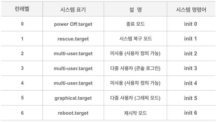 init 프로세스는 더 이상 사용하지 않음. (init 프로세스 → systemd)
