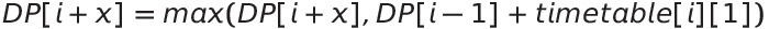DP[i + (timetable[i][0] - 1)] = max(DP[i + (timetable[i][0] - 1)], DP[i-1] + timetable[i][1])