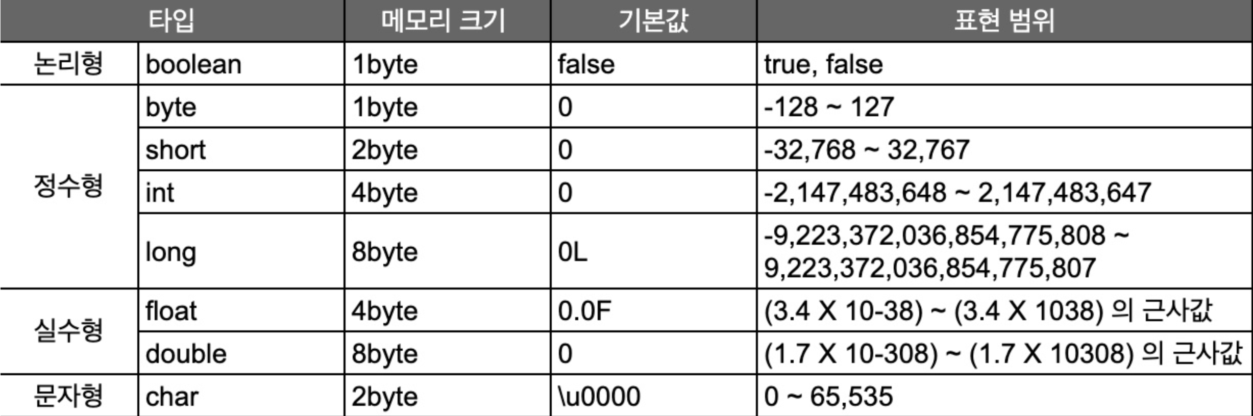 - 프리미티브 타입 종류, 값의 범위 그리고 기본 값