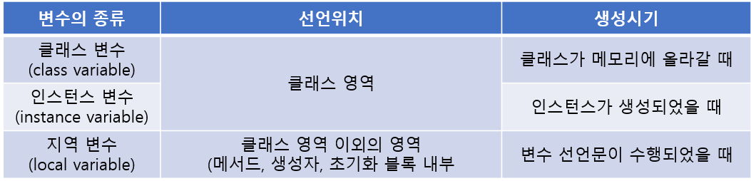 - 클래스 내부에 선언되는 변수를 멤버 변수(전역 변수)라고 하는데 그중에 static 키워드가 붙은 것은 클래스 변수, 없는 것은 인스턴스 변수이다.