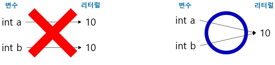 - 변수 a, b가 모두 10으로 초기화되면 각각 다른 10을 가리키는게 아니라 a, b 모두 10을 가리킨다.