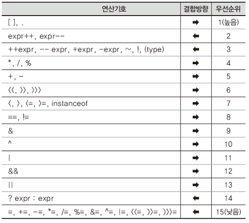 - 괄호를 제외하고 산술 → 비교 → 논리 → 대입 순서이다.
