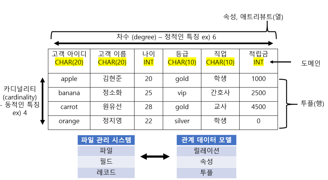 - 모든 릴레이션은 최소 1 이상의 차수를 유지해야 하고 잘 변하지 않아 정적이다.