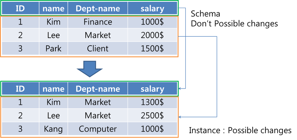 - 데이터베이스 스키마는 릴레이션 스키마의 집합을 의미하고 데이터베이스 인스턴스는 특정 시점의 릴레이션 인스턴스의 집합을 의미한다.