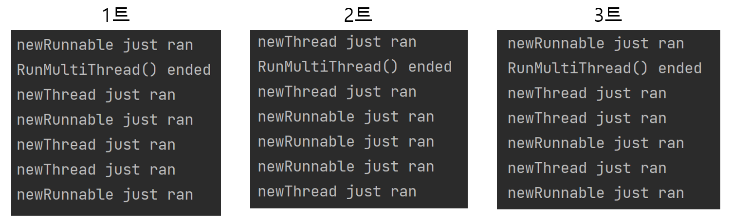 쓰레드는 구현한 순서에 영향을 받지 않는다. 컴퓨터의 성능에 따라 달라질 수 있고 매번 다른 결과를 도출한다.