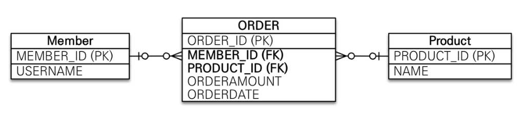 그래서 연결 테이블을 사용해서 일대다, 다대일 관계로 풀어서 표현한다.