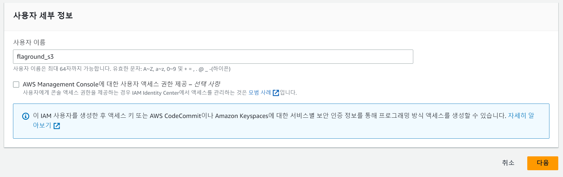 나는 각 서비스 별로 IAM을 따로 두는 편이라서 서비스에 사용되는 이름을 입력한다.