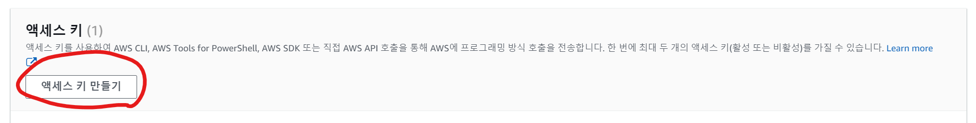 생성한 IAM에서 보안 자격 증명 탭에 들어가 중간에 위치한 액세스 키 메뉴에서 만들어준다.