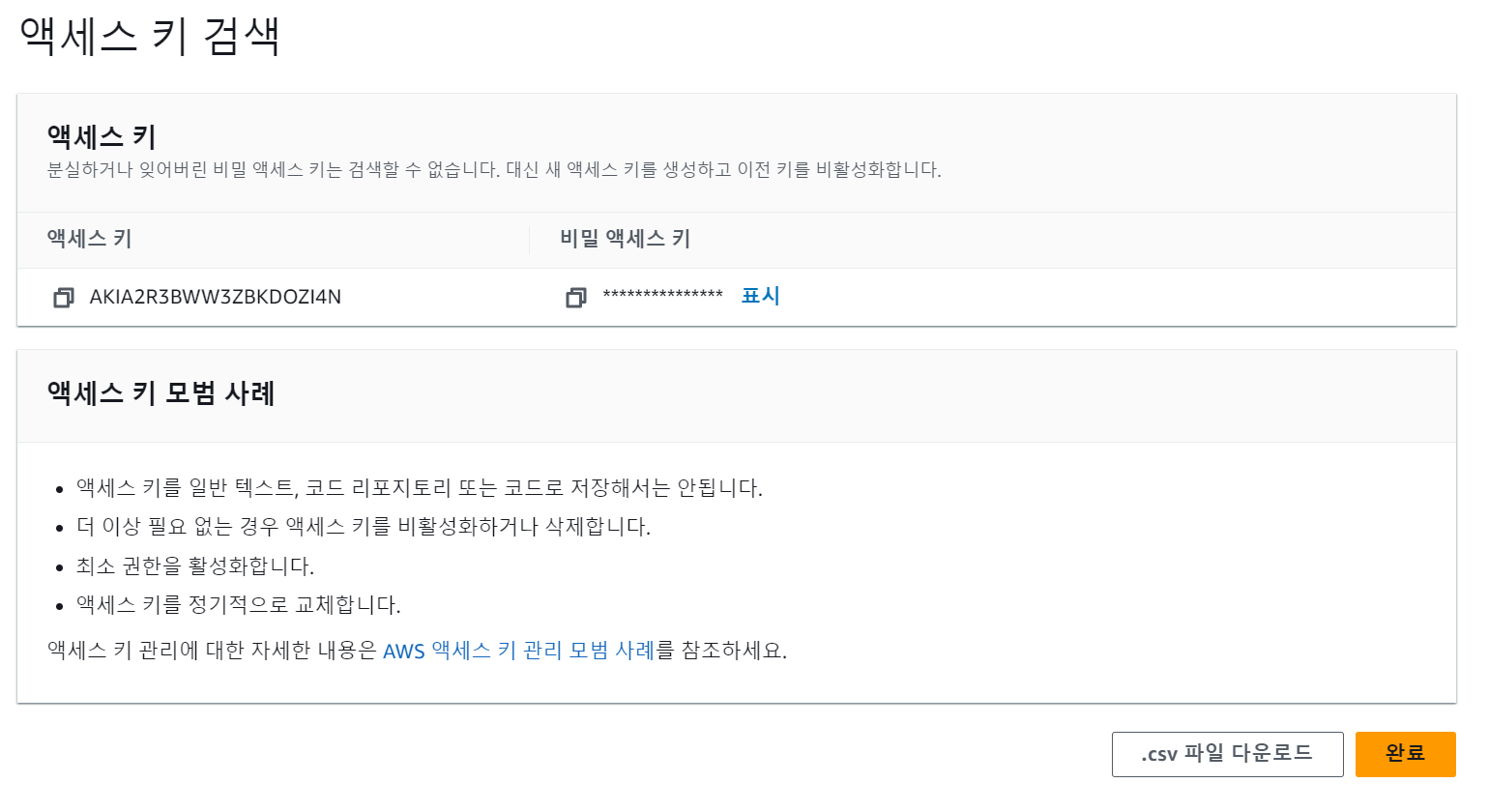 만들고 나면 이렇게 키를 발급해 주는데 비밀 액세스 키의 경우 다시는 볼 수 없으므로