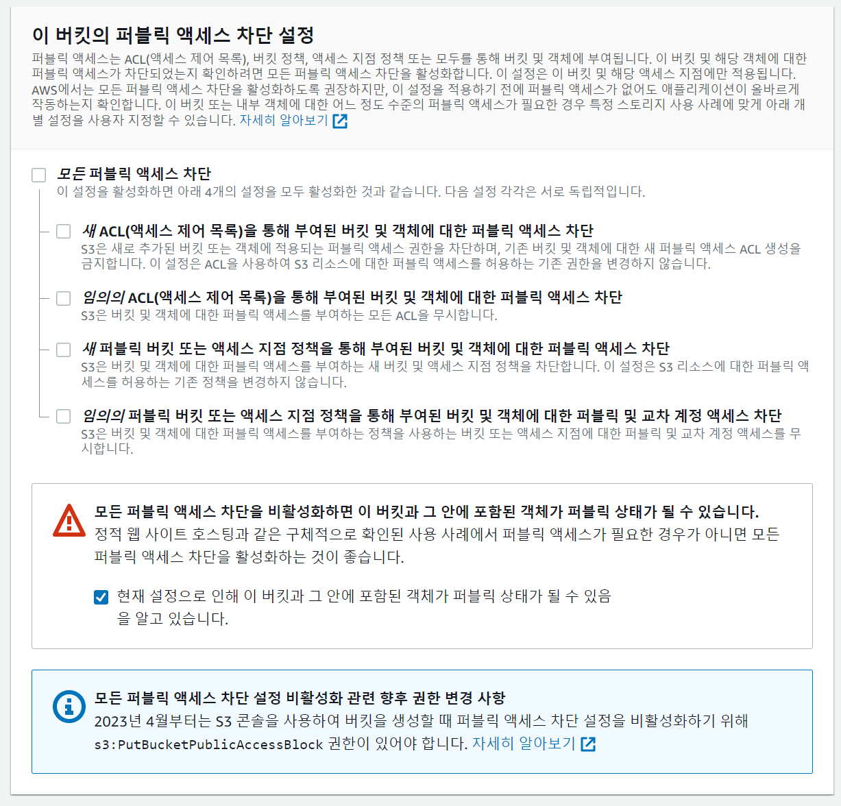 따로 정책을 설정해 줄 예정이라서 모든 퍼블릭 액세스를 허용해 주었다!