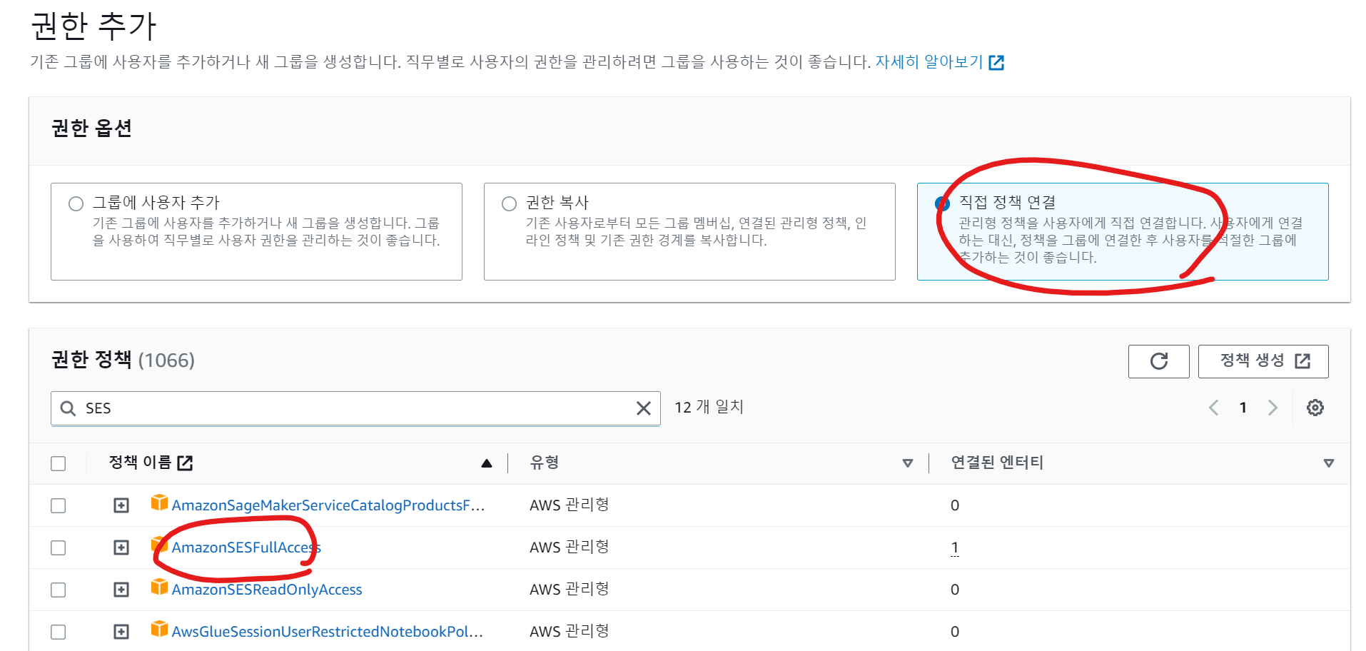 IAM 사용자의 권한 추가 페이지에서 SES 관련 정책만 부여해 주면 된다.