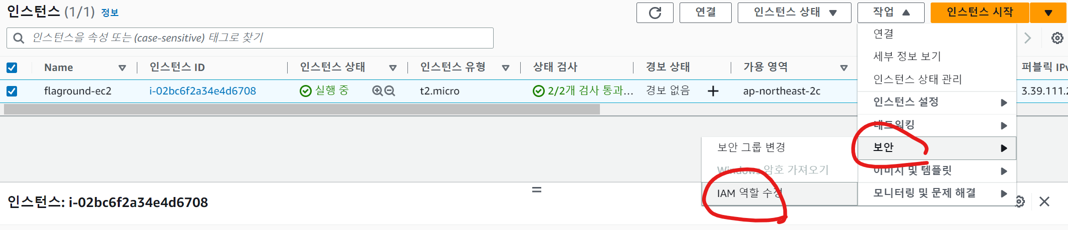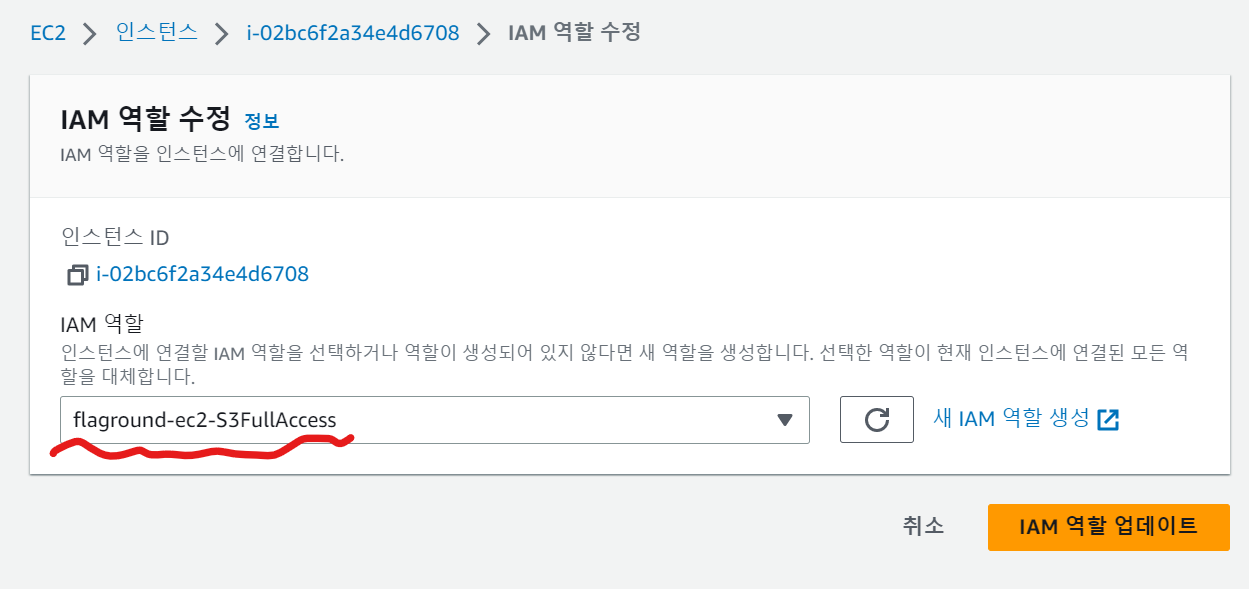 다음 EC2 콘솔로 돌아와서 생성한 IAM 역할을 적용해 주자.