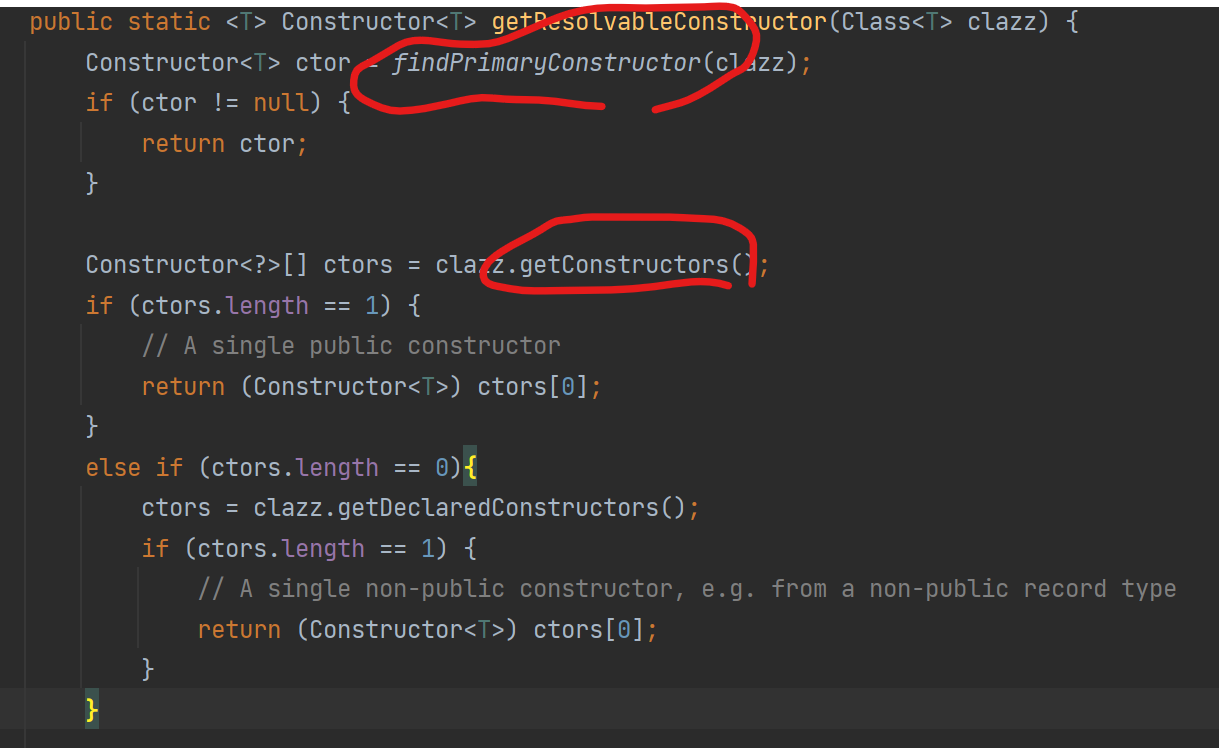 @Primary이 적용된 생성자를 우선적으로 선택한다. 어노테이션이 적용된 생성자가 없다면 가장 많은 파라미터를 받는 생성자를 리턴한다.- Java 리플렉션 API를 사용해서 생성자를 가져온다.