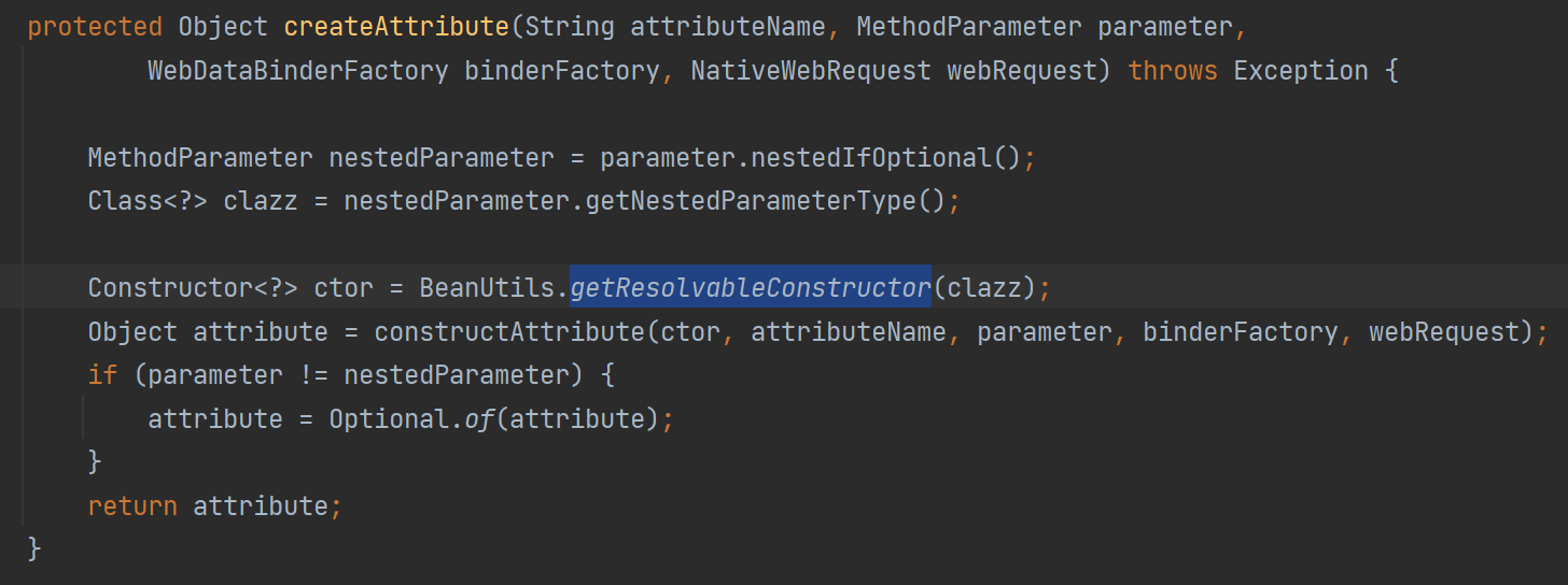 이 때, createAttribute() 메서드의 내부 구현을 보면 getResolvableConstructor() 메서드를 사용한다.