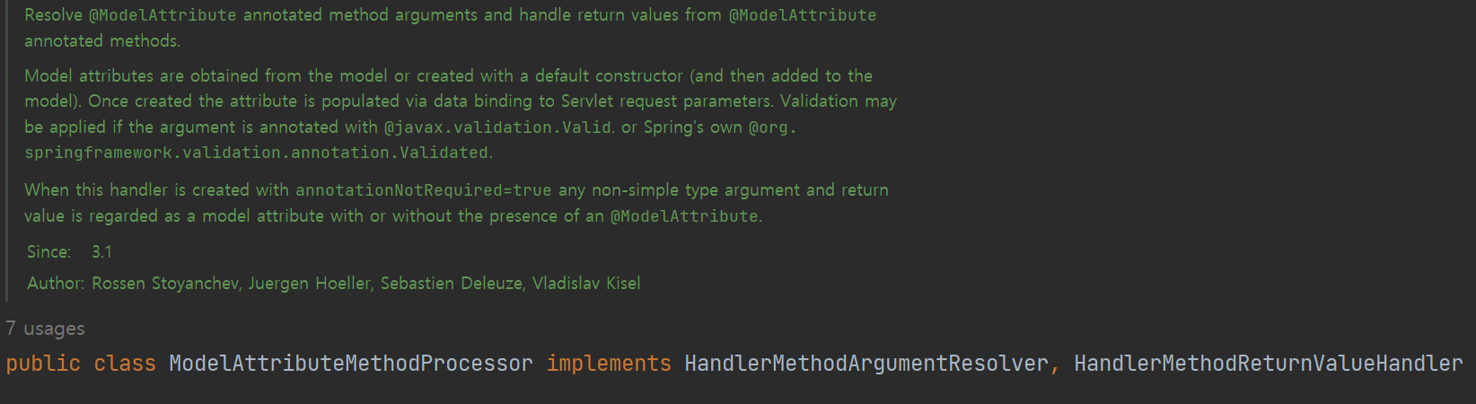Spring MVC에서 우선적으로 ModelAttributeMethodProcessor를 통해서 바인딩할 수 있는지 체크한다.