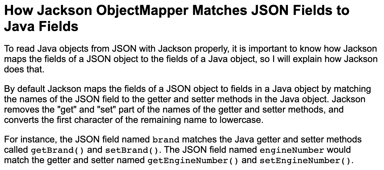 추가적으로, Jackson 공식문서에 따르면 ObjectMapper가 매핑할 때 내부적으로 getter 혹은 setter를 사용한다.