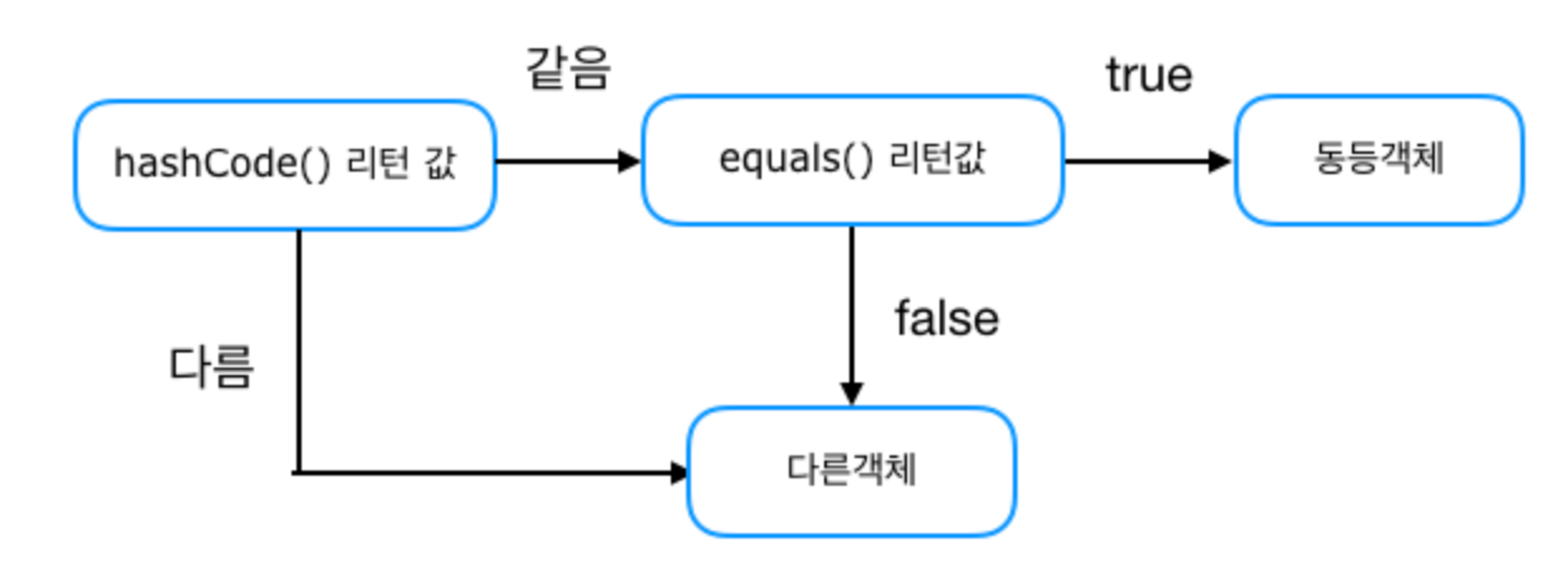 equals()에 사용되는 정보가 변하지 않았다면hashCode()도 같은 값을 반환해야 한다.equals()가 같다고 판단했으면 두 객체의hashCode()는 같아야 한다.equals()가 다르다고 판단했어도 두 객체의hashCode()는 같을 수 있다. (해쉬 충돌)