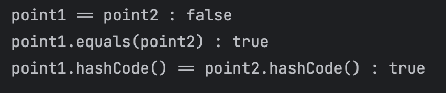 System.out.println("point1.hashCode() == point2.hashCode() : " + (point1.hashCode() == point2.hashCode()));