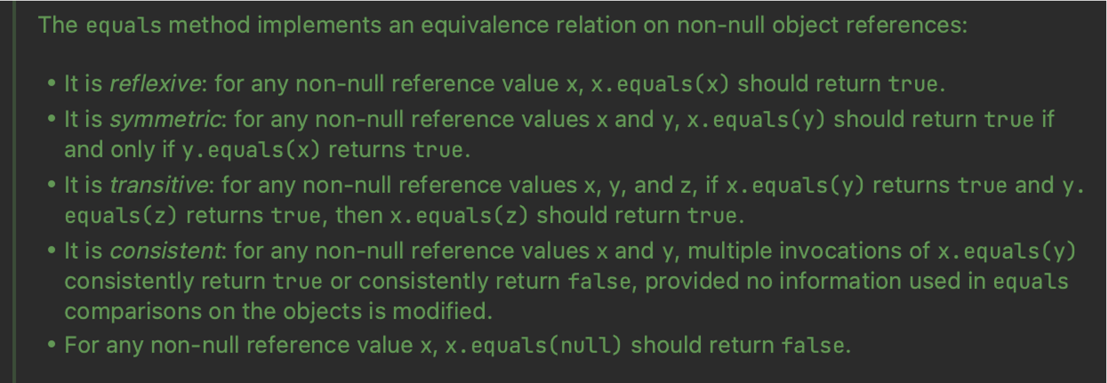 정리하면 null이 아닌 객체 x, y, z에 대해서 다음을 만족해야 합니다.