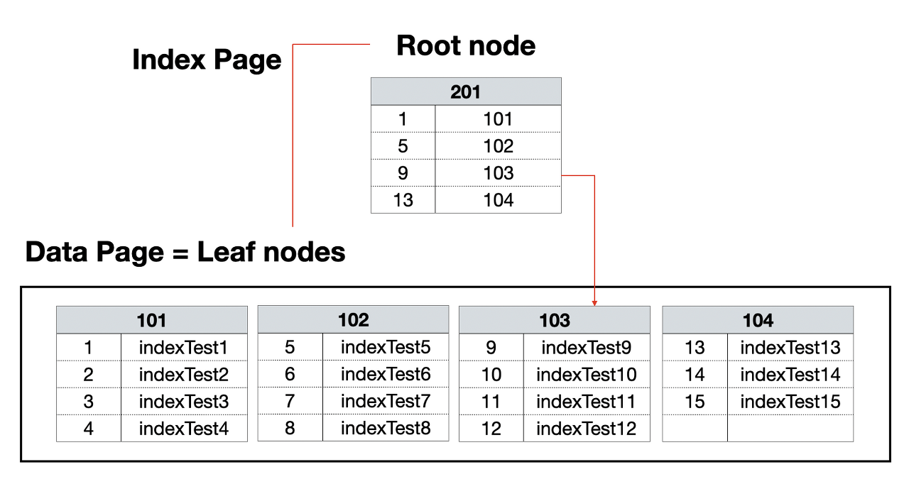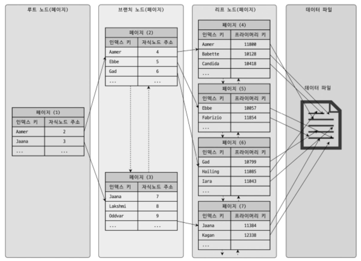 다음 그림과 같은 구조를 가지고 있는데, 리프 노드에 연결된 값이 실제 데이터의 기본키입니다.