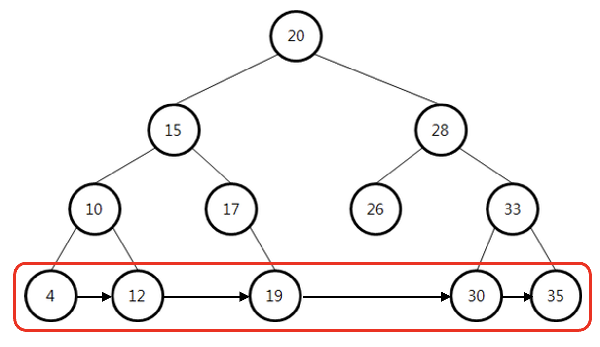 B-Tree에서 리프 노드끼리 연결시킨 구조가 바로 B+Tree입니다.