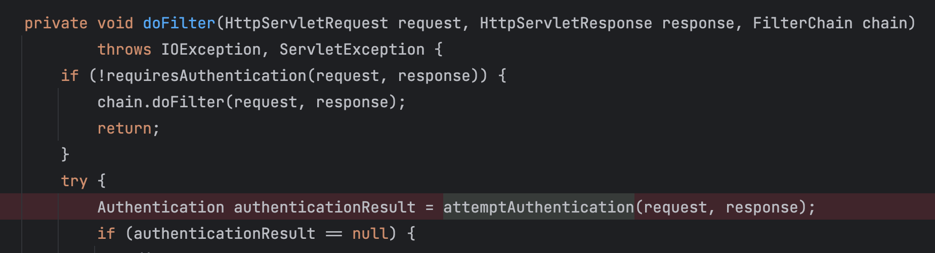 우선 모든 인증 절차를 받는 AbstractAuthenticationProcessingFilter에 doFilter()를 확인합니다.