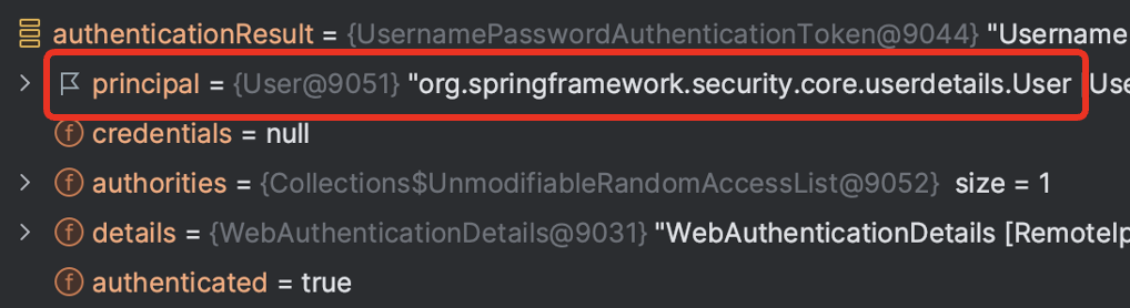 이후 정상적으로 인증을 마치고 돌아가면 다음과 principal에 이전과 다른 타입이 들어옵니다.