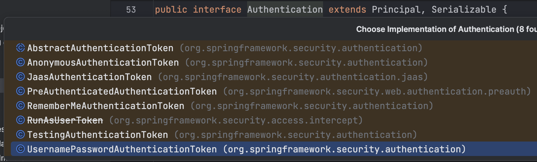 Authentication 인터페이스는 다양한 구현체를 제공하고 있습니다.