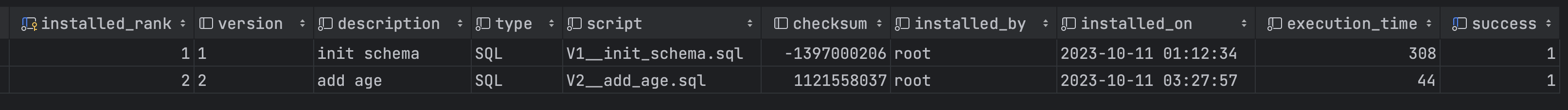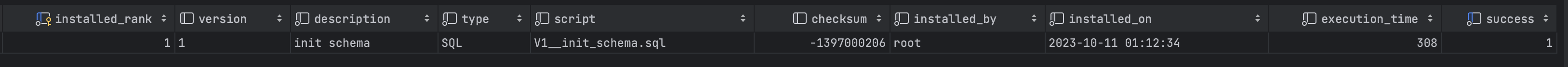 이후 flyway_schema_history 테이블이 생성되었고 조회해보면 다음과 같이 이력이 남게 됩니다.