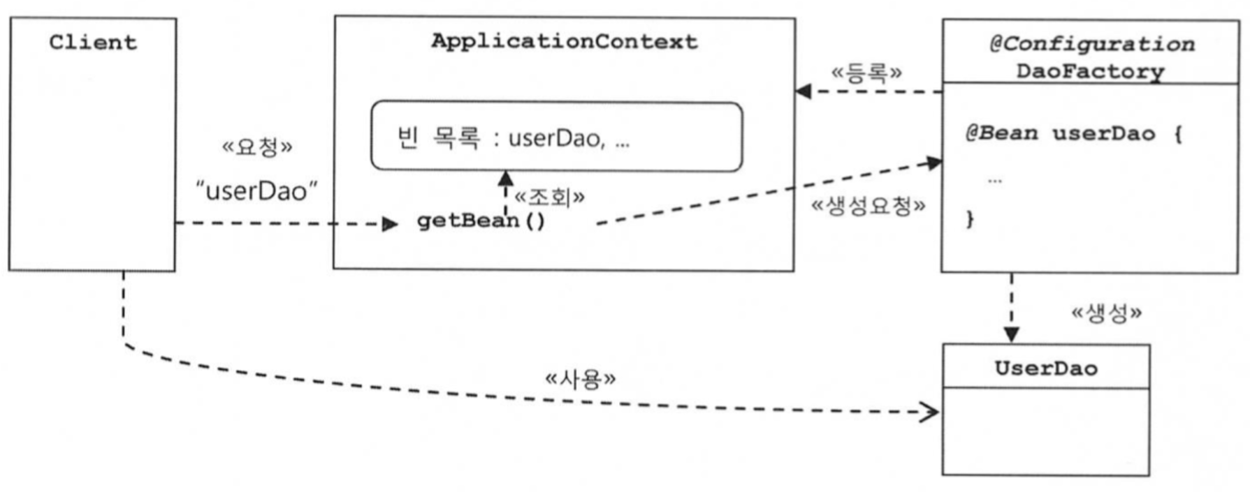 이후 getBean()으로 UserDao의 오브젝트를 가져올 수 있다.
